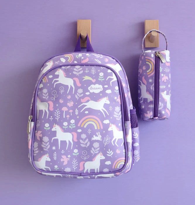 תיק גב גדול ומעוצב בצבע סגול מרגש והדפס איורים של חדי קרן.