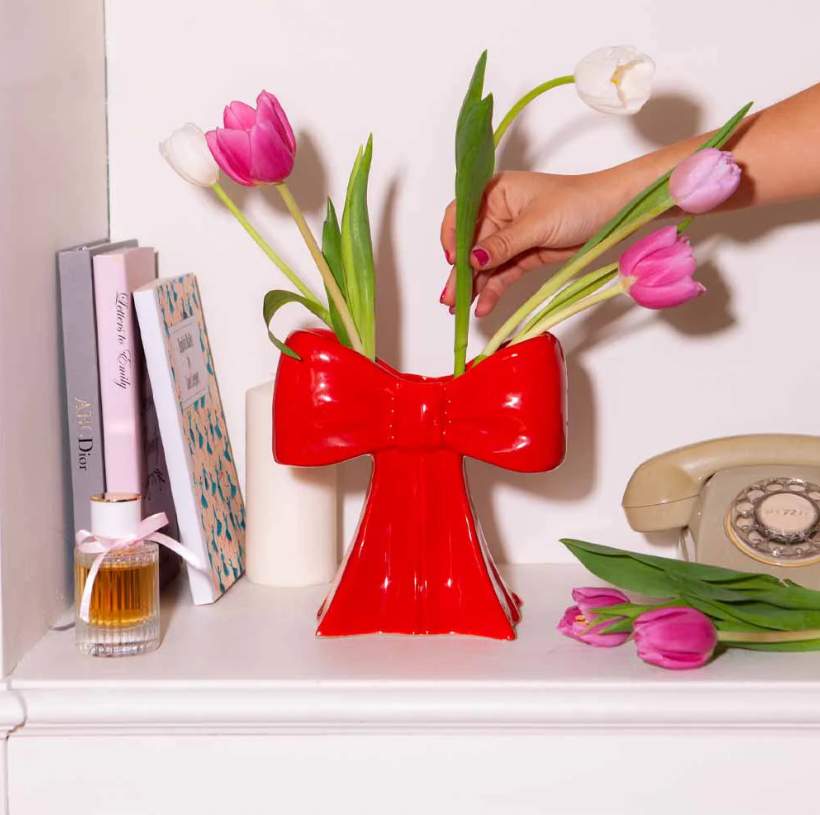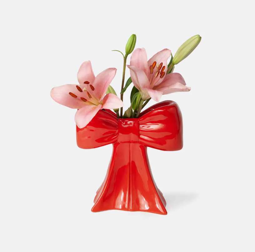 אגרטל מעוצב עשוי קרמיקה בצורת פפיון אדום, ה- אקססורי שהופך שולחן לתיאטרלי ומעוצב.