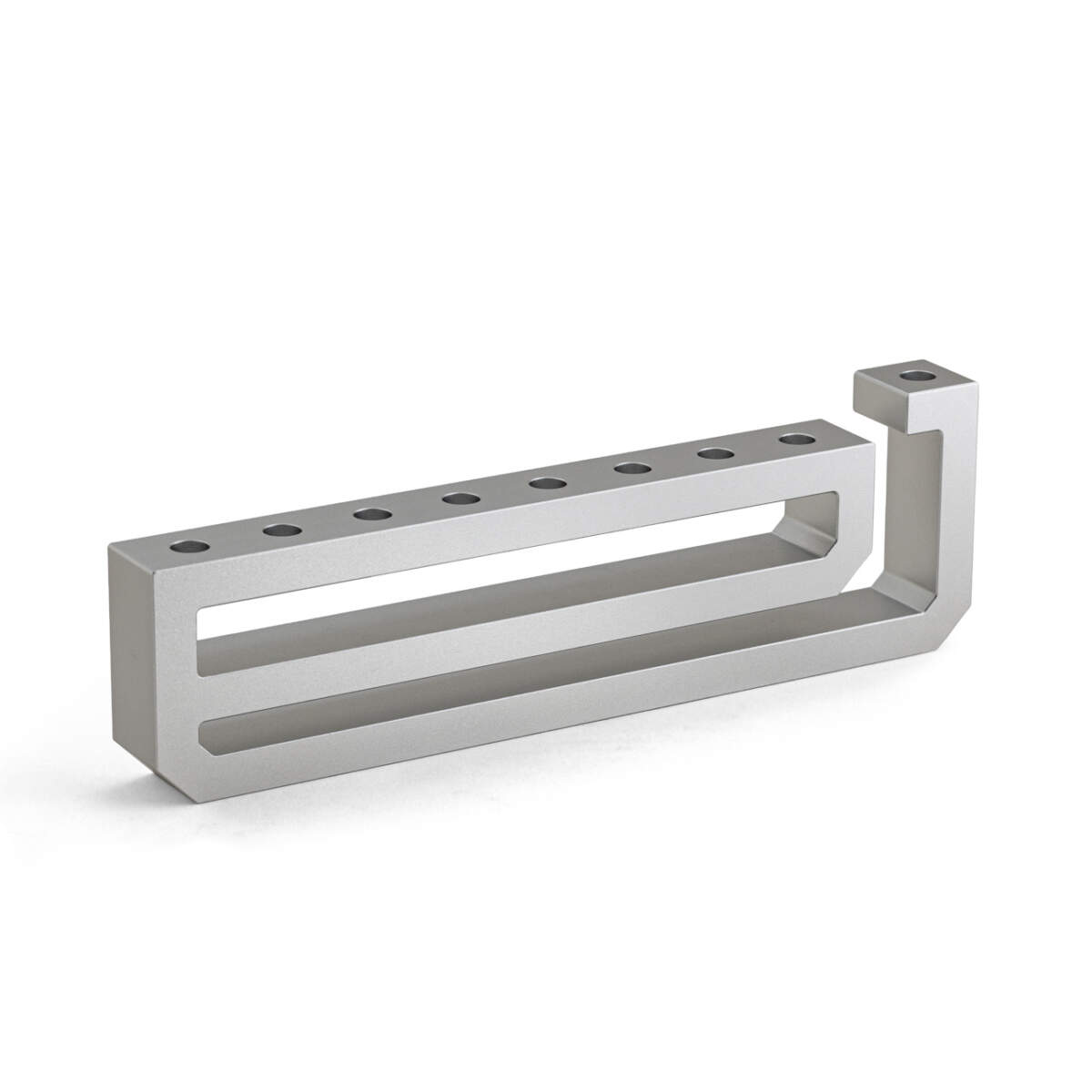 החנוכייה עשויה אלומיניום בגימור מט, כשמבנה הנרות מעוצב בהשראת אותיות המילה “נס” – זיכרון צורני ונוכח לנס חנוכה.
