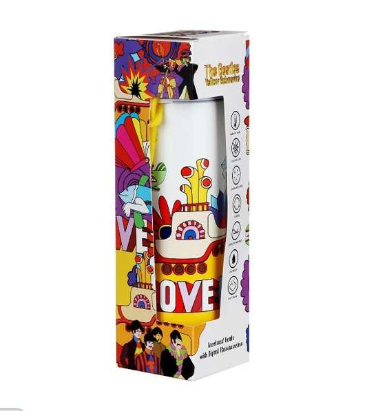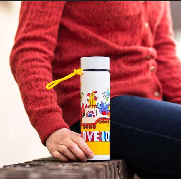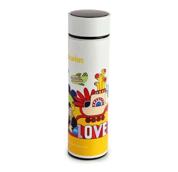 בקבוק תרמי בעיצוב הצוללת הצהובה מתוך סרט האנימציה האייקוני של הביטלס, צבעוניות פסיכדלית, וייב שמח וטוויסט טכנולוגי מפתיע.