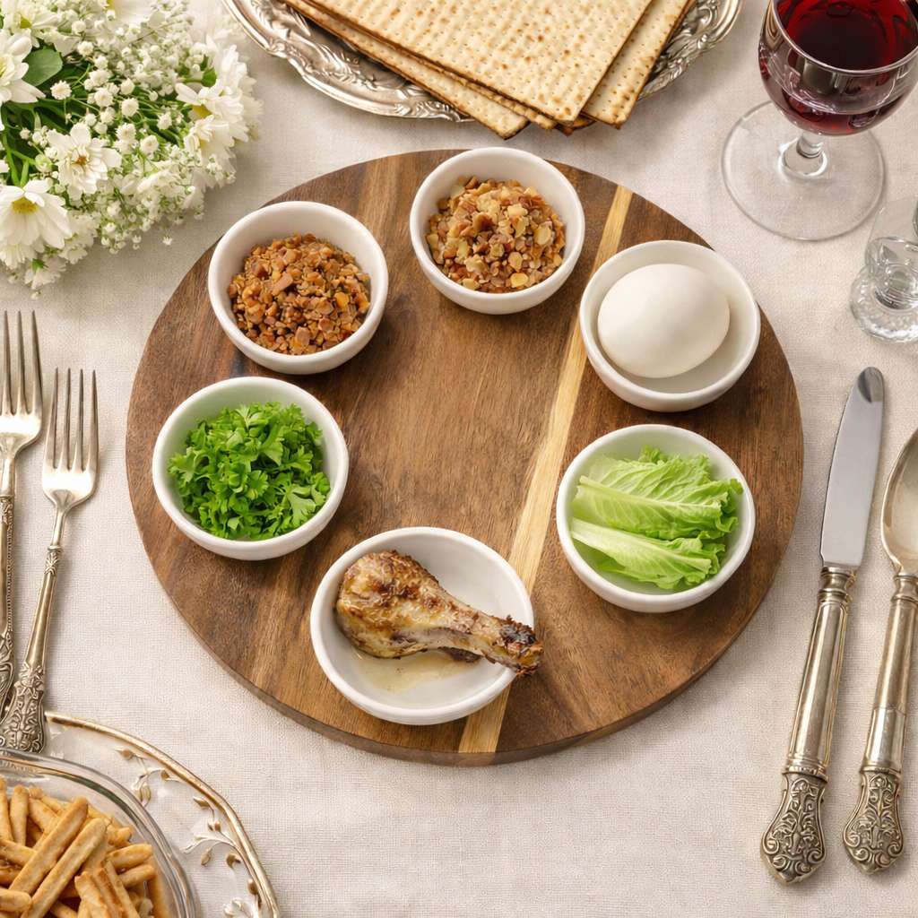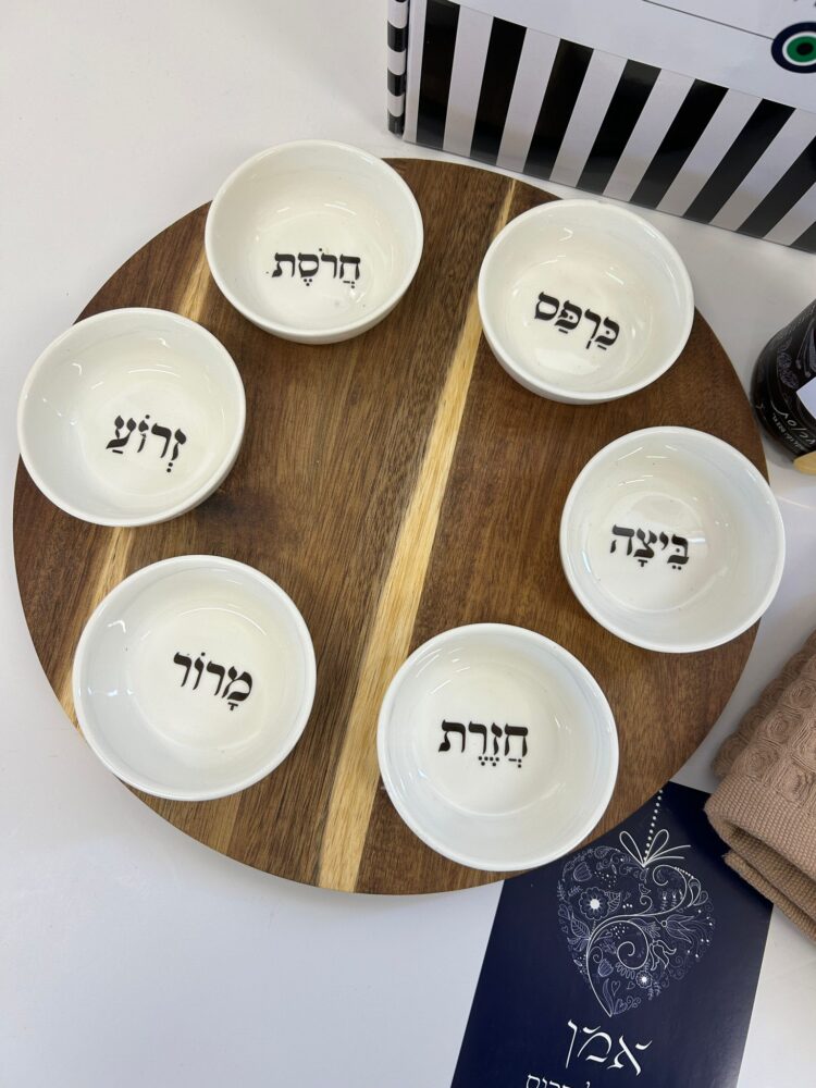 הצלחת מגיעה עם שש צלוחיות קרמיקה לבנות שעליהן מודפסים סימני הסדר – חרוסת, מרור, זרוע, ביצה, כרפס וחזרת – לנוחות שימוש ועיצוב חגיגי.