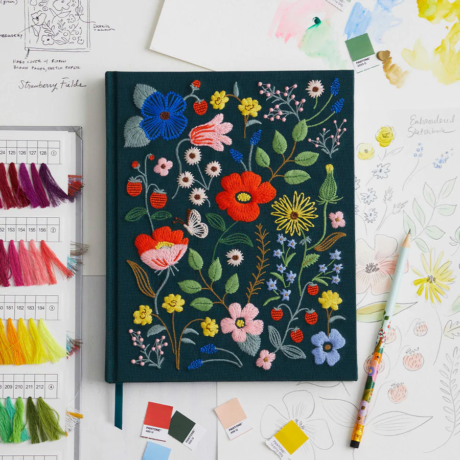 מחברת סקצ׳בוק מרהיבה עם כריכת בד קשה ורקמה פרחונית בעיצוב האייקוני של המעצבת אנה בונד מבית .Rifle Paper Co